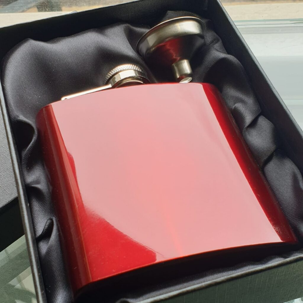 Presenting our striking personalised red hip flask, now presented in an elegant satin-lined card box with a handy funnel. Perfectly gift-ready for any man celebrating a special life event, this flask combines practicality with thoughtful personalisation at no extra cost.